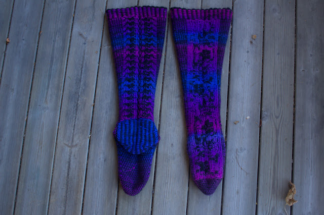 Sukat ovat todella kauniit ja varmasti olivat haastavat neuloa! Tuo sukkien väri sointuisi täydellisesti Vallilan Satumetsä-tapetin sävyihin, tulipa vaan mieleen, kun olen tässä tapetteja katsellut... :) Mukavaa syksyä!